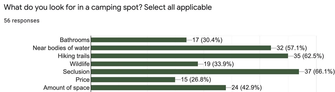 I created a survey to find out the in’s and out’s of camping. Why do people go camping? Who do they go with? What do they sleep in? Do they look for specific things in a campsite? What activities do they participate in while camping? How many days do they camp? How do they find spots? I asked a lot of questions, and I got results!